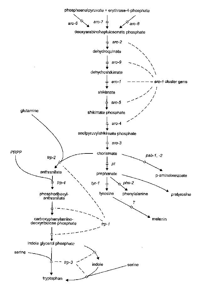 Structural gene for DAHP synthase (Trp) (EC 4.2.1.15), one of three isozymes inhibitable by tyrosine, phenylalanine, and tryptophan, respectively (Fig. 13). Grows on minimal medium except when both phenylalanine and tyrosine are present (822). Both activity-negative and allosteric-inhibition-negative alleles have been found (821). aro-7 aro-8 nic-1; aro-6 stocks are available (FGSC 4489, 4490).