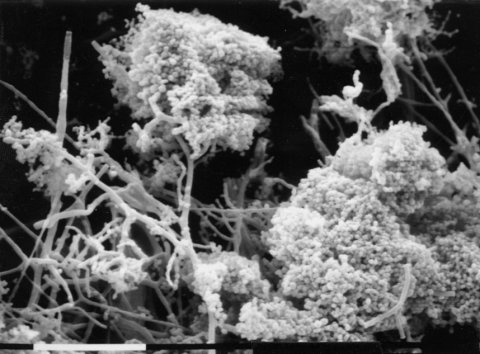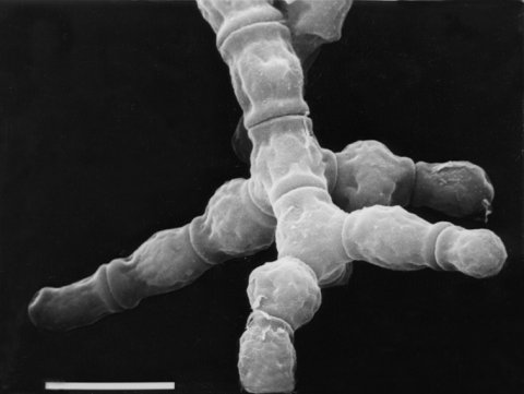 FIGURE 14 The mutant at: attenuated, showing the formation of conidia in aggregates. Clumping of conidia can be seen macroscopically. Bar length 0.1 mm. Scanning EM photograph from M. L. Springer.