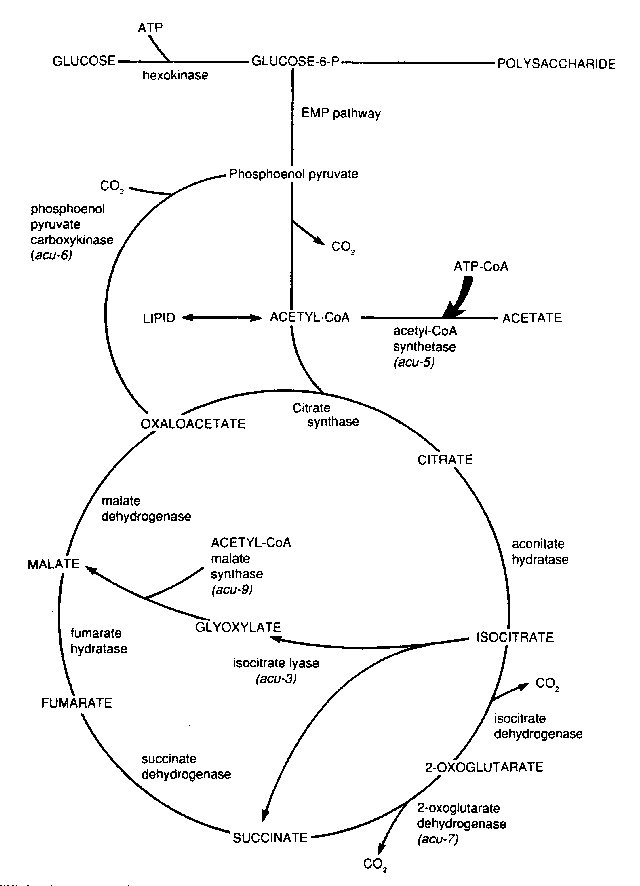 Unable to use acetate as a carbon source. When ammonium acetate (3 mg/ml) is the sole carbon source, the wild type shows sparse but positive growth, in contrast to clear blanks for acu mutants. Mutants are selectable by inositol-less death on acetate medium. acu-1, acu-5, acu-6, and acu-7 do not behave as respiratory mutants in tetrazolium-overlay tests on acetate medium (593). Positions of mutants in the metabolic pathway are shown in Fig. 4.