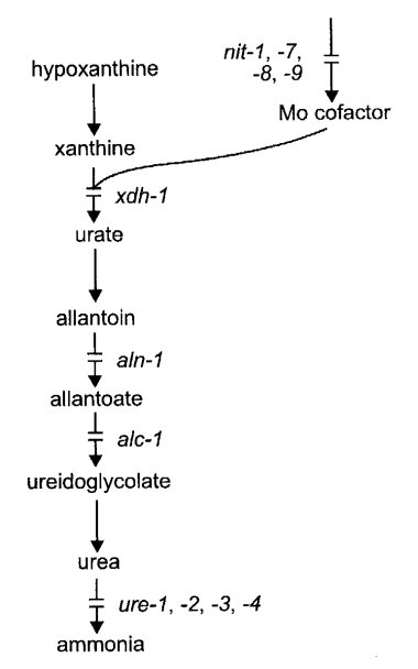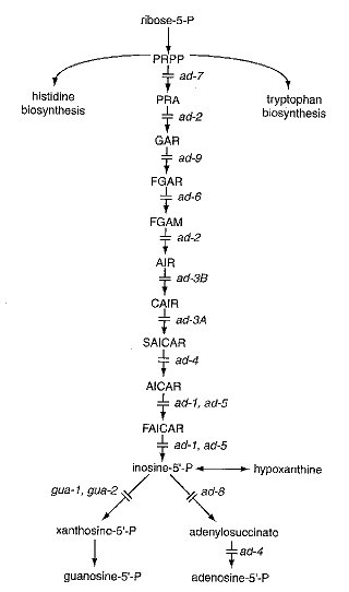 Resistant to purine analogs 8-aza-adenine and 8-azaguanine. Sensitive to 2-6-diaminopurine. Obtained and scored as described for aza-1. Resistance is recessive in a heterokaryon. Called aza-adenine-resistant (995). Strains lost (991).