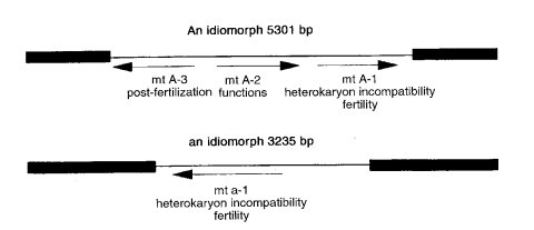 FIGURE 41Structural and functional regions of the mating type idiomorphs of N. crassa. The idiomorphic DNA sequences are indicated by lines, and the conserved flanking regions are indicated by boxes. Arrows indicate the direction of transcription. From ref. (744 ) [Glass, N. L., and M. A. Nelson (1994). Mating-type genes in mycelial ascomycetes. In "The Mycota" (R. Brambl and G. A. Marzluf, eds.), Vol. I, pp. 295-306, Fig. 1.], with permission. Copyright 1994 Springer-Verlag.