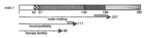 Encodes a DNA-binding protein similar to Podospora FMR1 in mating function (53). Mutational analysis (1796) (Fig. 42). The MAT A-1 polypeptide has a short but decisive stretch of homology with MAT1p of Saccharomyces. Inactivation by RIP shows mat A-1 to be essential for mating identity, mating functions that follow fertilization, and mat-associated vegetative incompatibility (743, 1796). Mutant mat A-1m99, which is heterokaryon-compatible and fertile with mat a when used as a female but not as a male, is due to a base-pair substitution that results in a truncated protein. Mutant A-1m13, which is heterokaryon-compatible and produces perithecia but no ascospores with mat a, is a frameshift (1796). Other mutants lose both the mating and the vegetative incompatibility functions simultaneously (777) as a result of frameshifts in mat A-1 (741).