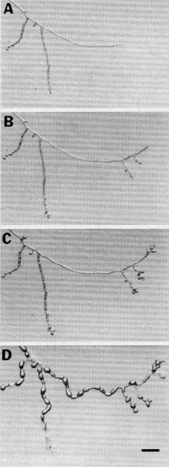 FIGURE 43 Loss of growth polarity in the mcb mutant at restrictive temperature. (A) Hyphae of an mcb strain after overnight incubation at 25C on a dialysis membrane overlying sucrose minimal agar medium. The hyphae shown in (A) were shifted to 37C and photographed after 1.5 (B), 3 (C), and 9hr (D). Note that growth polarity is lost in all regions of mcb hyphae grown at 37C for 9 hr, and that apolar growth continues until hyphal compartments burst (D). Bar length = 100 mm. From ref. (247 ) [Bruno, K. S. et al. (1996). EMBO J. 15: 5772-5782.], with permission from Oxford University Press.