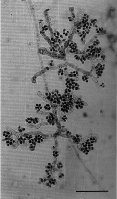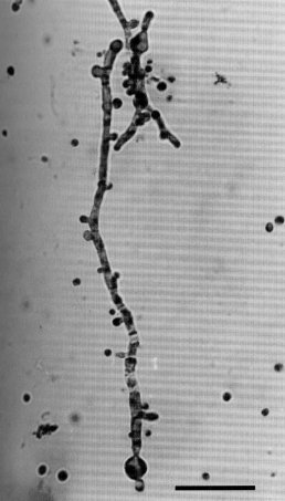 FIGURE 44 Microcycle microconidiation by an mcm strain ~12 hr after inoculation of air-grown macroconidia into liquid shake culture at 22C. Microconidia are produced as lateral protuberances (arrows) on the microcycle structure produced by a germinated macroconidium. Free microconidia also are present. Bar length = 25 mm. From ref. (1250 ), with permission from the Society for General Microbiology.