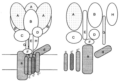 FIGURE 66 A diagram of the vacuolar membrane ATPase. Subunits in the hydrophilic portion have been given capital letters and those associated with the membrane lower-case letters. Symbols: A, Vma-1; B, Vma-2; D, Vma-8; E, Vma-4; F, Vma-7; G, Vma-10; H, Vma-13; a, Vph-1; c, Vma-3; c , Vma-11; d, Vma-6 (1271 ).