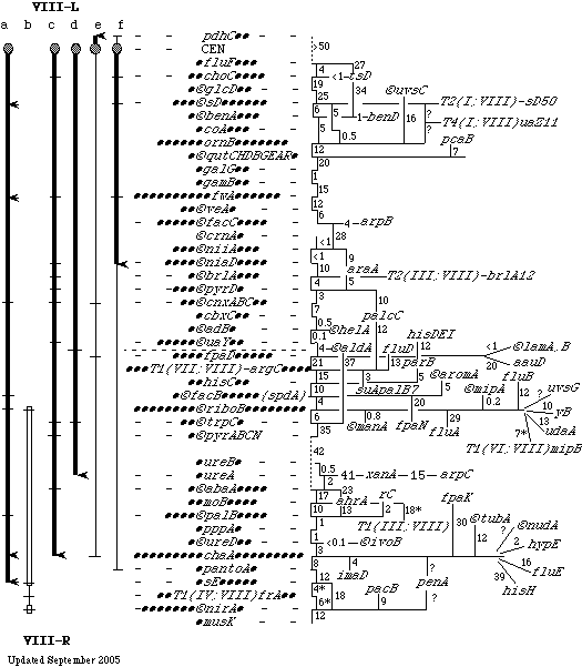 The top of the diagram represents the conventional left of the chromosome, and the bottom, the right. See below and VIII Linkage data