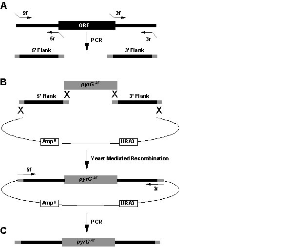 . Strategy for generation of deletion constructs. (A) Amplification of 5’ and 3’ gene specific flank fragments from A. nidulans genomic DNA. Primers 5r and 3f have 5’ extensions complementary to the pyrGAf cassette, whereas 5f and 3r have 5’ extensions complementary to the vector. (B) Cotransformation of yeast with the 5’ flank and 3’ flank together with the pyrGAf cassette and a gapped yeast shuttle vector generate a plasmid containing the gene specific deletion construct (Colot et al, 2006). (C) The final linear deletion construct is generated by PCR from the yeast DNA with primers 5f and 3r.Table Example primer set.