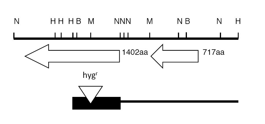Insert-containing clones were detected by hybridization of colony blots with a radioactively labeled hygromycin resistance gene probe. A restriction map of the cloned insert relative to the genomic region in which it is contained is shown in Figure 1.
