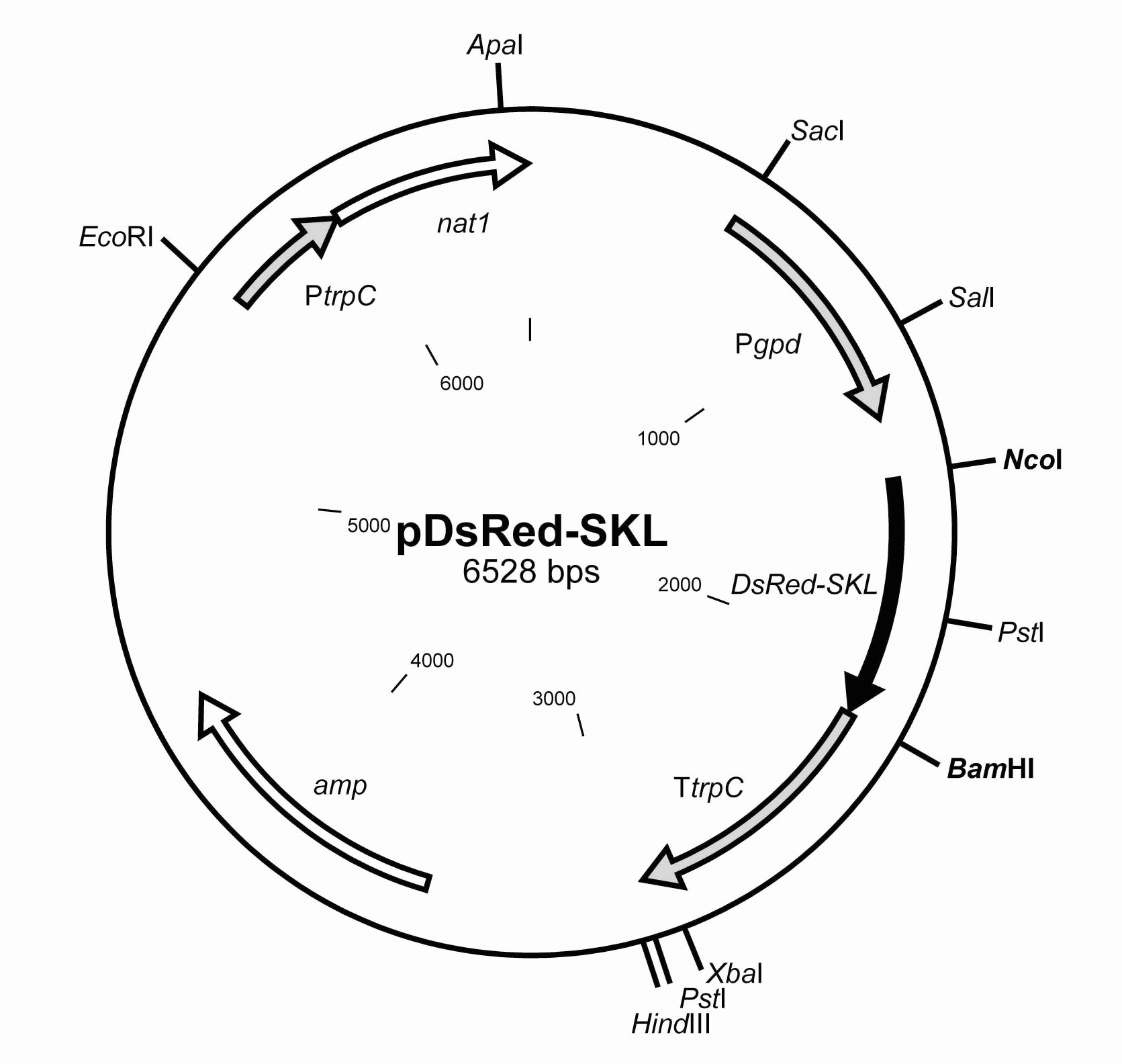 Here, we constructed a DsRed-SKL plasmid on which the DsRed-SKL gene is driven by the constitutive gpd promoter of Aspergillus nidulans. This plasmid enables the co-localization with GFP-tagged proteins.