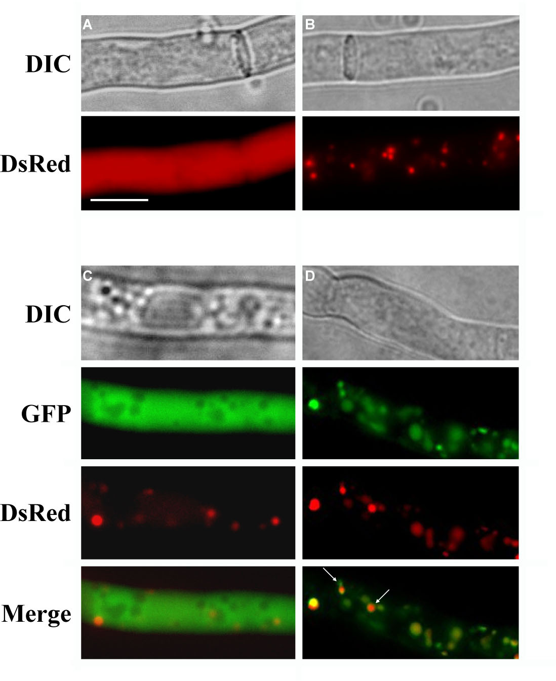Figure 2. Expression of cytosolic and peroxisomal targeted DsRed and GFP in S. macrospora. (A) Hyphae of a strain transformed with pRHN1. (B) Hyphae of a strain transformed with pDsRed-SKL. Expression of DsRed-SKL leads to DsRed import into peroxisomes, visible as red dots in the cytoplasm. (C) Co-transformation with pIG1783 and pDsRed-SKL results in green fluorescent hyphae with red colored peroxisomes. (D) Parallel expression of SKL-tagged GFP and SKL-tagged DsRed. Both tagged proteins are not imported into the same exact organelle at the same rate, resulting in green or red dots after merging (see white arrows). Scale bar, 10 µm. A color reproduction of the figure is available with the on-line version of this article (http://www.fgsc.net/).