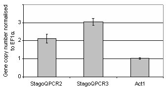 The validity of using qPCR to determine gene copy number was investigated by two different approaches. Firstly, the technique was applied to confirm known copy numbers of DNA regions within the S. nodorum genome uncovered from the genome assembly and annotation (Hane et al., 2007). To do this, the genome assembly of S. nodorum was screened for two and three copy high scoring pairs (HSP) of >95% identity and 300-1000bp length via blastn (Altschul et al., 1997), excluding those with undesirable sequence such as polyN tracts and short sequence repeats. These regions were subsequently named StagoQPCR2 and StagoQPCR3 for the two and three copy regions respectively. Primers were designed at sequence termini using Primer3 (Rozen and Skaletsky, 1999) (qPCR2f 5' GAACCATGTCATCCTCTCAGG 3'; qPCR2r 5' ACTTCGCCTTGACCTTAACC 3'; qPCR3f 5' ACGAGAGAGAGGCAAGATGC 3' and qPCR3r 5' GCGATTGTCTATCGTGTATTCC 3' ). Expected copy number was confirmed by in silico PCR (Schuler, 1997). Previously studied genes encoding γ-actin (Act1f 5' AGTCGAAGCGTGGTATCCT 3' and Act1r 5' ACTTGGGGTTGATGGGAG 3') and elongation factor 1α (EF1α f 5' CTCATCGTCGCCATCAAC 3' and EF1α r 5' TGTTGTCGCCGTTGAATC 3') were used to represent single copy regions within the genome (Solomon et al., 2006b; Solomon et al., 2006c). Genomic DNA from each of the strains was extracted using a Retsch MM301 autolyser and Qiagen BioSprint 15 and diluted to 6.7 ng μl-1, a concentration determined through template dilution experiments to provide optimal reaction efficiency for each of the primer combinations (data not shown). qPCR reactions were performed in technical triplicates and comprised of 5 μl of the diluted DNA, 5 μl of combined forward and reverse primers (1.2 μM) and 10 μl iSYBR qPCR mix (BioRad). The reactions were placed in a RotorGene 3000 (Corbett Research) and denatured at 95°C/3min followed by 40 cycles of 95°C/10s, 57°C/10s and 72°C/20sec. Fluorescence of the sample spectrum was acquired using 470 nm excitation filter and detected at 510 nm during each annealing stage. The relative concentration of the amplified DNA was calculated using the comparative quantification feature in the RotorGene 3000 software (http://www.corbettlifescience.com/). Briefly, the relative concentration is based on takeoff point and the reaction efficiency of each reaction and its comparison to a determined calibrator sample, which for this example, was simply S. nodorum SN15 at the above mentioned diluted concentration. The results in Figure 1 represent the copy numbers calculated for each of StagoQPCR2, StagoQPCR3 and Act1 normalised to the single copy EF1α. Subsequent melting curve analysis confirmed the absence of any non-specific amplification (data not shown). The copy numbers revealed for each of genes closely correlated to the known copies in the genome sequence, thus confirming the validity of the described qPCR technique to determine copy number.
