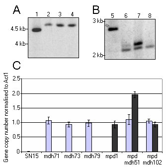 Figure 2. (A and B) Southern blots of strains S. nodorum SN15 (lane 1 and 5), mdh71 (lane 2), mdh73 (lane 3), mdh79 (lane 4), mpd1 (lane 6), mpdmdh51 (lane 7), mpdmdh102 (lane 8). The Southern shown in (A) was screened for a probe specific for Mdh1 whilst (B) was screened for Mpd1 (modified from (11)). (C) A histogram representing the copy number of either the phleomycin resistance gene (light grey) or hygromycin resistance gene (dark grey) in the strains used for the Southern analysis in (A) and (B). Panels (A) and (B) has been adapted from Solomon et al. (2006d).
