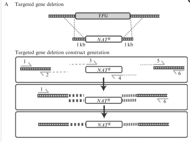 For folks trying to determine what region is deleted at each locus, they can match the sequence of W2 and W5 (uppercase letters) to the genome. The sequence in between W2 and W5 has been replaced with the drug cassette. The lowercase letters of W2 and W5 primers are the sequences homologous to the drug cassette.