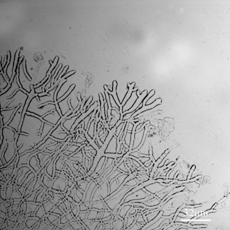 Micrograph of hyphae grown between sheets of cellophane for 24 - 48 hrs at 25 C