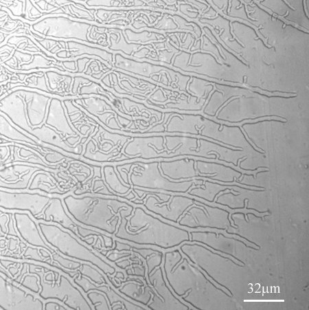 Micrograph of hyphae grown between sheets of cellophane for 24 - 48 hrs at 25 C