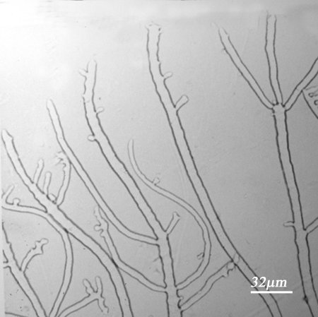 Micrograph of hyphae grown between sheets of cellophane for 24 - 48 hrs at 25 C