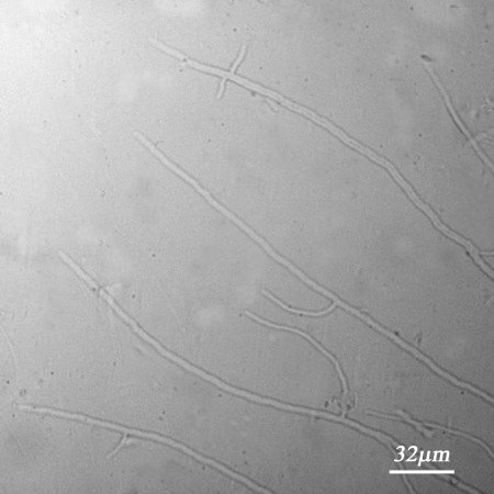 Micrograph of hyphae grown between sheets of cellophane for 24 - 48 hrs at 25 C