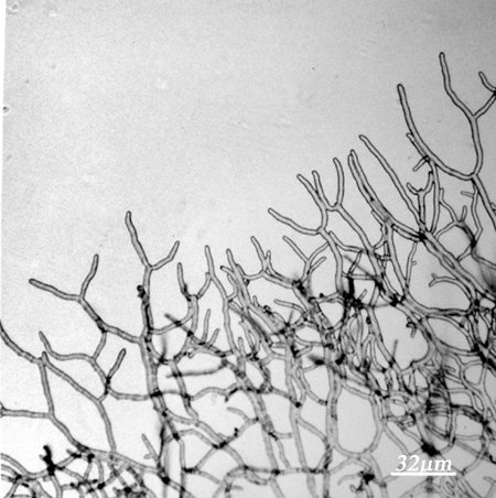 Micrograph of hyphae grown between sheets of cellophane for 24 - 48 hrs at 25 C