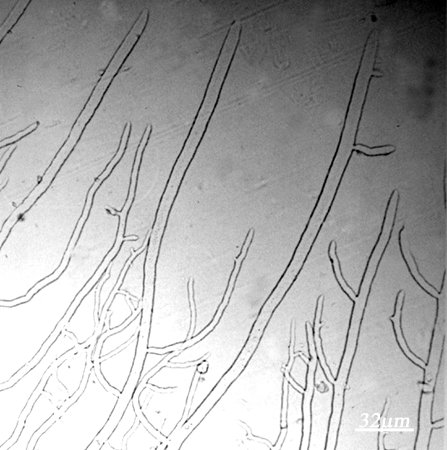 Micrograph of hyphae grown between sheets of cellophane for 24 - 48 hrs at 25 C