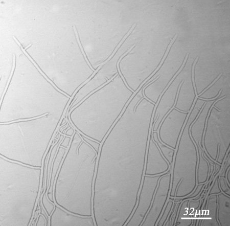 Micrograph of hyphae grown between sheets of cellophane for 24 - 48 hrs at 25 C