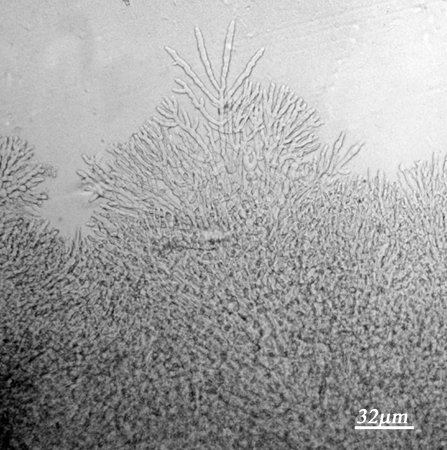 Micrograph of hyphae grown between sheets of cellophane for 24 - 48 hrs at 25 C