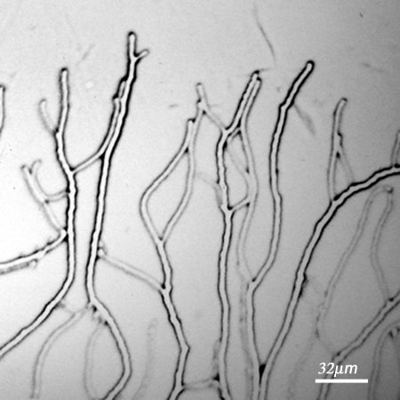 Micrograph of hyphae grown between sheets of cellophane for 24 - 48 hrs at 25 C