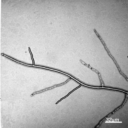Micrograph of hyphae grown between sheets of cellophane for 24 - 48 hrs at 25 C