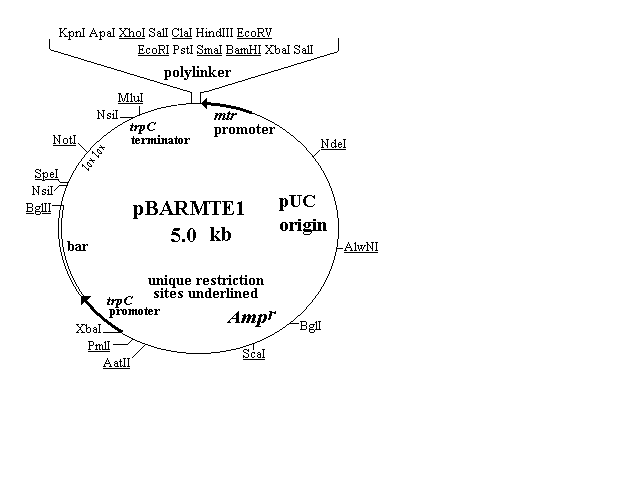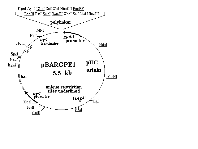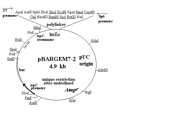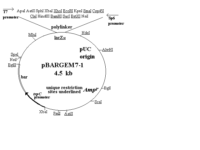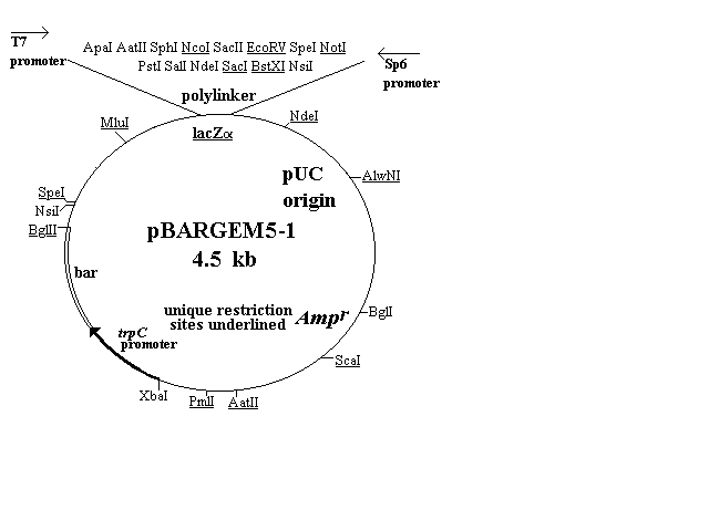 The first four of the vectors are shown in Figure 1 and described in the text. Three of them (pBARGEM5-1, pBARGEM7-1, and pBARKS1) are each about 4.5 kb and all four carry the bar gene under control of the Aspergillus nidulans trpC promoter. The polylinkers from the pGEM and Bluescript vectors are shown at the top of each restriction map, with the four to eight sites that are unique in each construct underlined.