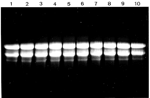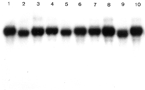 Figure 1. Total RNAs (10 µg per lane) from 10 different preparations (lanes 1-10) were electrophoresed on a 1.2% agarose gel containing 2% formaldehyde. Visualization was done by staining with ethidium bromide and irradiation with UV. The major bands correspond to 28S and 18S rRNA, faint bands to 23S, 16S and 5S rRNA.