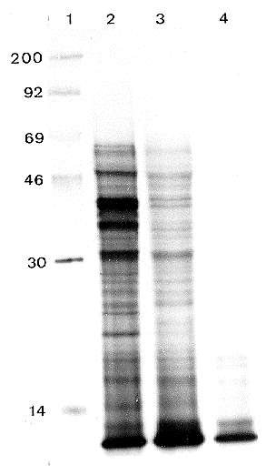Figure 3. SDS-PAGE (12.5%) of 35S-methionine-labelled in vitro translation products. Lane 1: 14C-labelled marker proteins, molecular wieghts are indicated on the left (Mr x 10(-3). Lanes 2 and 3: RNA prepared from mycelia grown in rich or ammonium depleted medium respectively. RNA probes correspond to lanes 1 and 2 in Fig. 1 and 2. Lane 4: control translation without RNA.