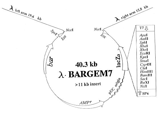 Figure 2. Diagram of the BARGEM7 vector. The restriction sites EcoRI and XhoI (in the polylinker) and SpeI are unique in BARGEM7. Cre-mediated recombination between the two lox sites adjacent to the two arms releases the plasmid sequence. Inserts of up to 11.5 kb can be inserted into this vector and be packaged into coats. The vectors lambda-BARMTE1, lambda-BARGPE1 and lambda-BARGRG1 are similar except that they lack blue/clear screening from lacZalpha complementation and possess fungal promoters and terminators for expression of polylinker-inserted sequences in fungi.
