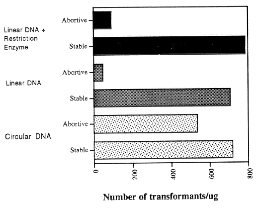 The effect of DNA structure on the generation of abortive transformants is shown in Fig. 2. Abortive transformants are defined as those which begin to grow and form small colonies on the selection plates, but stop growth prior to making a large colony; these transformants fail to grow upon transfer, and are thought to reflect cases in which the transforming DNA enters the cell but fails to become stably integrated into the genome. The use of linear instead of circular DNA caused a great reduction in the numbers of abortive transformants that were obtained; the addition of restriction enzyme did not have a significant effect on the stable/abortive ratio.