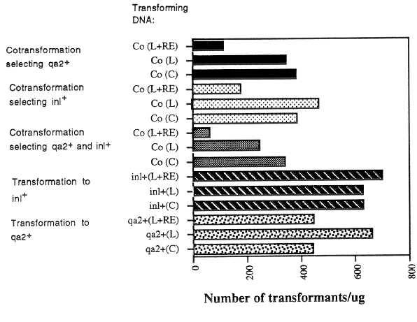 Preparation of spheroplasts [from a qa-2 aro-9 inl al-2 a (RLM 63-01, a gift of Dr. R.L. Metzenberg) strain of N. crassa] and their transformation were as previously described (Schweizer et al. 1981 Proc. Nat. Acad. Sci. USA 78:5086-5090). For the single transformation experiments, 1 ug of DNA (circular or linear) was mixed with 100 ul spheroplasts; where noted, 1 ul of the appropriate restriction enzyme, at 15 U/ul, was added to the linear DNAs immediately prior to transformation. In cotransformation experiments, a total of 2 ug DNA (1 ug each plasmid), plus 15 U each enzyme (where specified) was added to 100 ul spheroplasts. Transformants were regenerated in liquid medium and spread onto selection plates (Akins and Lambowitz 1987 Cell 50:331-345). In the cotransformation experiments, the regenerated spheroplasts were divided and spread onto plates selective for qa-2+, inl+ or both qa-2+ and inl+.