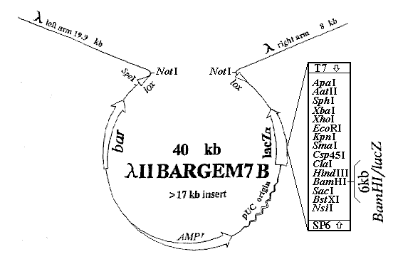 lambda IIBARGEM7B shares with the earlier lambda BARGEM7 vector the fact that plasmids can be easily excised from lambda by Cre/lox- mediated recombination (automatic subcloning, see earlier 1994 references) and plasmids can then be used to directly transform fungi, selecting for transformants using the bar selection (Pall, 1993. Fungal Genet. Newslet. 40:58). In addition, new vectors can be used to make libraries with inserts of over 18 kb and these inserts can be phosphatased before ligation, helping prevent insertion of two inserts into the same clone. The phosphatasing of inserts is possible because the vector arms, without stuffer fragment, are too small to package, preventing formation of large numbers of clones without inserts. The lambda IIBARGEM7B vector can be used to construct libraries of Sau3AI partial digest fragments into the BamHI site of the polylinker (Fig. 1) because the lambda arms lack any BamHI sites. This research was supported by funds from the College of Sciences, Washington State University.