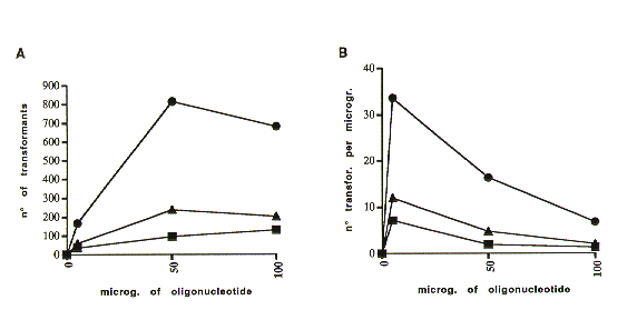 The x asis, in both diagrams, reports the amount of oligonucleotide, expressed in micrograms. The y axis in A reports the number of Benomyl-resistant colonies, and in B the ratio between the number of Benomyl-resistant colonies and the amount of oligonucleotide used. B.30 B.40 B.50 indicate the 30, 40 and 50-mer anti-sense oligonucleotides.