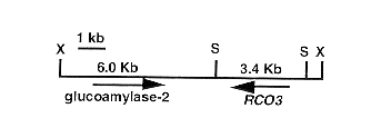 Figure 2. Organization of the gla-2 and rco-3 genes of N. crassa. The 10 Kb XbaI (X) fragment contains a 3.4 Kb SmaI fragment (S).