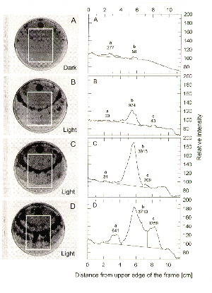 Figure 1. Analyses of digitized video camera images of light-promoted conidiation of Neurospora crassa bd, al-2 with a densitometry computer program. A is a dark control, B-D are examples of light-promoted conidiation. The region of intensity integration is indicated by a white rectangle. Peak areas of the bands of conidia are indicated in the respective intensity plots right of the images, which show the integrated intensities (x-direction) against the y-direction.