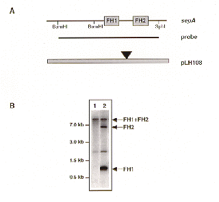 Figure 3. Circular integration of the sepA/tn5seq1 cassette at the A. nidulans sepA locus. A. BamHI/SphI restriction map of the sepA locus, the position of the sepA probe used in panel B, and the disruption vector pLH108. B. Verification of disruption of the sepA locus by Southern analysis. BamHI restriction digest of the parental A. nidulans strain ATW17 (lane 1), and a sepA integration event (lane 2). FH = formin homology.