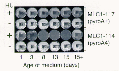 Figure 1. Time course of vitamin B6 inactivation by hydroxyurea. Defined medium with or without 10 mM HU was prepared on day zero and stored at room temperature. HU was added to medium after autoclaving. Strains were streaked to single colony on medium with or without HU on days 1, 3, 8, 13, and 15. All cultures were incubated at 37oC for 48 hours. Medium indicated by 15+ was supplemented with additional pyridoxine immediately before use. MLC1-114 (wA2; pyroA4); MLC1-117 (wA2, pabaA1).