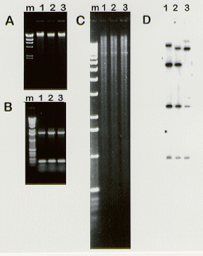 Figure 1 : A. Ethidium bromide (EtBr)-stained agarose gel of three representative samples (lanes 1-3) of genomic DNA of A. fumigatus prepared from intact conidia using the Amersham Nucleon MiY kit. B. EtBr-stained agarose gel of PCR products obtained by amplification of 3 independent Nucleon MiY-purified A. fumigatus genomic DNA samples (lanes 1-3). Primer pairs were used that yield 150 bp and a 1.55 kb DNA fragments. C. EtBr-stained agarose gel of 3 independent Nucleon MiY-purified A. fumigatus genomic DNA samples digested with BamHI (lanes 1-3). D. Southern blot of the gel shown in C, probed with a 0.9 kb BamHI fragment of the A. fumigatus rho2 gene. Molecular weight markers (lambda DNA cut by HindIII in Panel A and 1kb Ladder in Panels B and C) are shown (lane m)