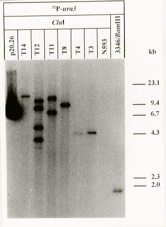 Figure 3. Autoradiograph from a Southern hybridization experiment with DNA from A. niger transformants. DNA from six transformants (T3, T4, T8, T11, T12 and T14) and from the recipient strain N593 was digested with ClaI and separated by gel electrophoresis. The Southern blot was probed with a DNA fragment, representing the open reading frame and adjacent regions of the ura3 gene. As a control, the transforming plasmid p20.26 and DNA from a S. macrospora wild type strain (L3346) were used. Sizes of marker fragments are given on the right margin.