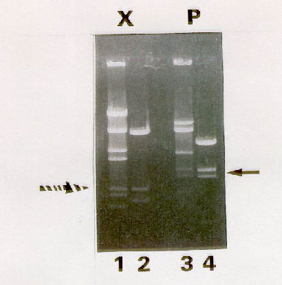Figure 2: XhoI (lanes 1,2) and PstI (lanes 3, 4) digestions of pG1(lanes 1 and 3) and pAN903 (a plasmid containing the uapC gene cloned, lanes 2 and 4). The 1.5 and 1.6 kb bands of the PstI digestion (black arrow), and the 0.9 kb band of the XhoI digestion (hatched arrow) are characteristic of the restriction enzyme pattern of the DNA sequence of the uapC gene.