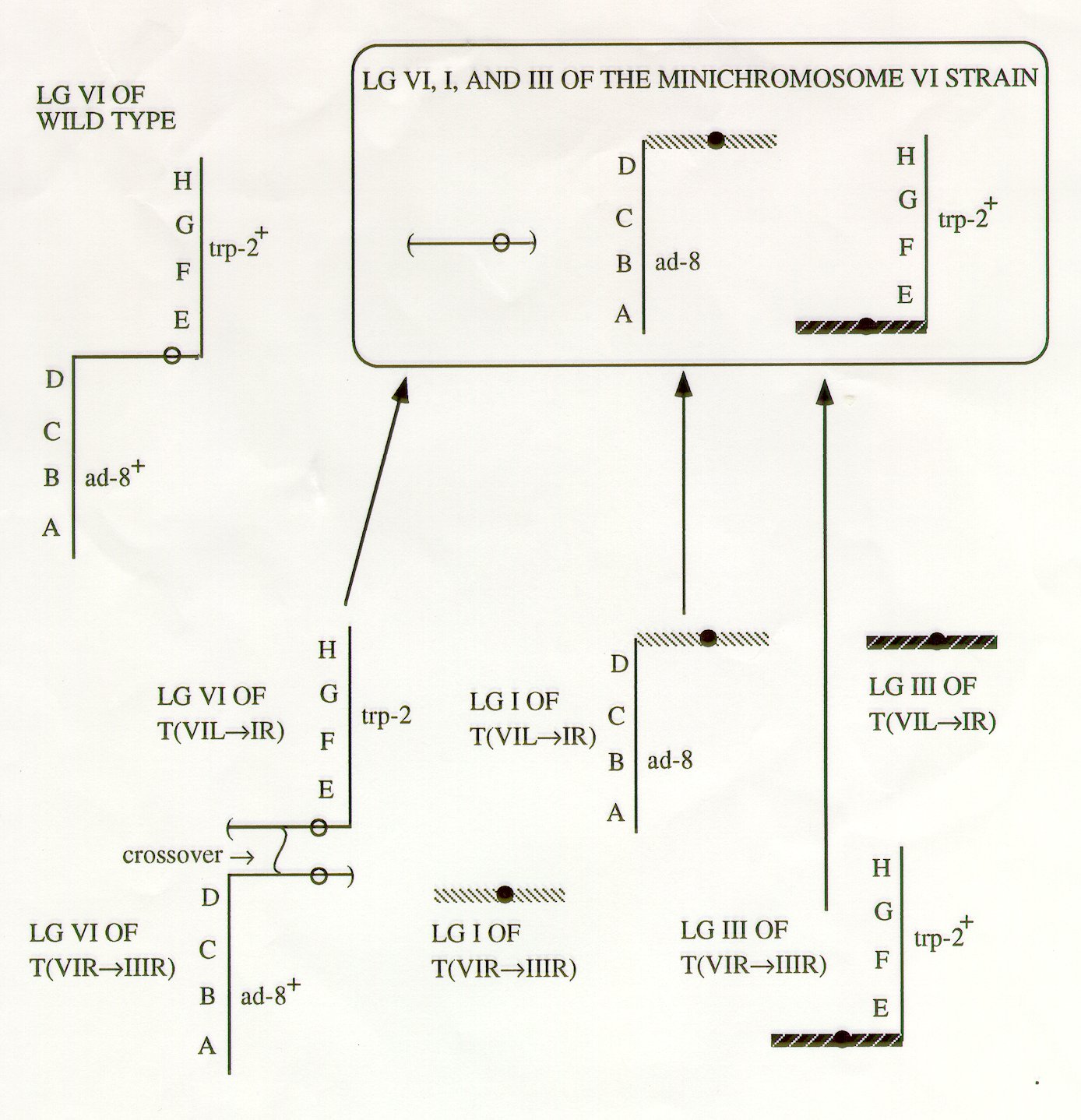 Figure 1. Construction of a euploid strain with a minichromosome of LG VI, showing the relevant three linkage groups. The chromosomes are not drawn to scale. Only one chromatid of each bivalent is shown. T(VIL IR) and T(VIRIIIR) are T39M777 trp-2; ad-8 and prototrophic OY329 , respectively. The wild type LG VI is also diagrammed for comparison.