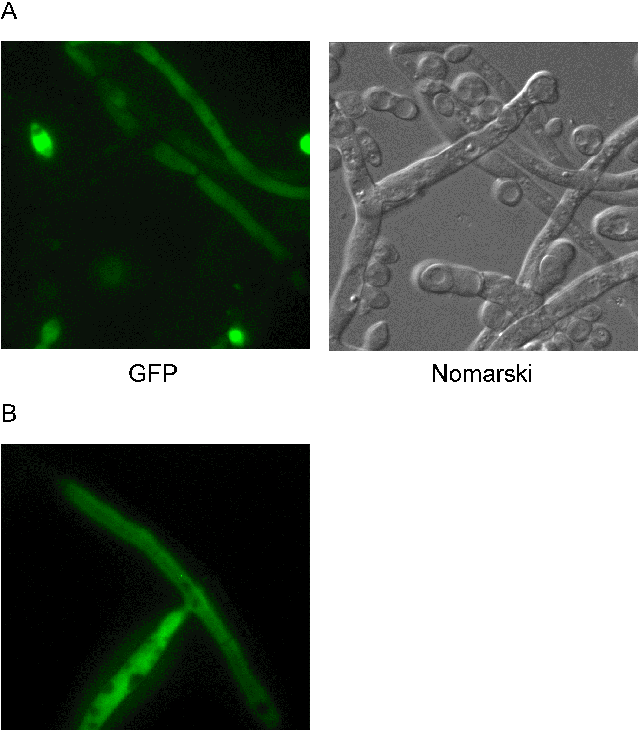 We transformed a N. crassa his-3 strain (FGSC# 6103) with pCT74 by electroporation (B.S. Margolin et al., 1997, FGN 44:34 and 2000, FGN 47:112). Transformants were selected on minimal medium supplemented with histidine and hygromycin B (Hyg; 200 ug/ml). Variable expression of GFP was detected by microscopy in macroconidia and hyphae of transformants carrying randomly integrated copies of ToxA-sGFP (Fig. 1A). Germinated conidia accumulated enough GFP in hyphae to be detected after overnight incubation at 32o C. Expression in young hyphae was strong and fairly uniform in most single copy transformants, whereas older hyphae showed lower fluorescence. GFP appeared to accumulate in macroconidia. As has been observed in plants (J. Haseloff and B. Amos, 1995, Trends Genetics 11:328), GFP appeared to accumulate in the nucleoplasm and to be excluded from vacuoles.