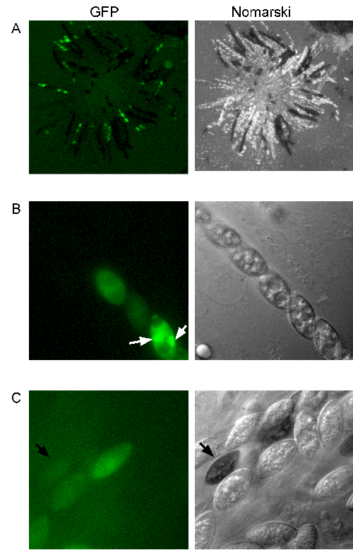Figure 2: Expression of GFP in sexual tissues. (A) Perithicia from a heterozygous cross of the heterokaryotic GFP+ strain TMF153-9 (male) to FGSC #2490 (female) were squashed at approximately 10 - 14 days post fertilization to extrude developing asci and examined for GFP expression. Tissue in early stages of post fertilization development apparently did not express GFP. GFP+ / GFP- segregation patterns are evident. Images were captured as described in Fig.1, except that a 5X Plan-Neofluar objective (N.A. 0.15 mm) was used. Exposure times had to be increased to 100 ms; exposure times for the Nomarski images were approximately 10 ms. (B) Segregation of GFP- / GFP+ ascospores in one ascus. GFP appears to accumulate in nuclei (white arrows). (C) GFP can be detected even in melanized ascospores (black arrow). Images in (B) and (C) were captured as described in Fig. 1.