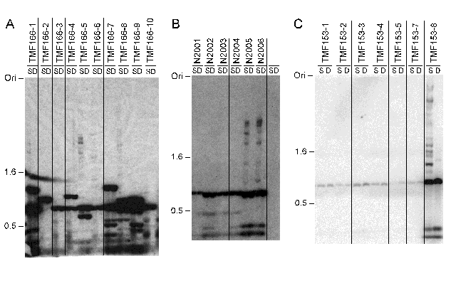 Figure 3: DNA methylation analysis of selected sGFP+ transformants. (A) Southern analysis of genomic DNA isolated from transformants with randomly inserted copies of sGFP showed that sGFP remained mostly unmethylated (TMF166-1 to -10). Genomic DNA of sGFP+ transformants was digested with methylation-sensitive (Sau3AI; S) or methylation-insensitive (DpnII; D) isoschizomers, fractionated in agarose gels, blotted to nylon membranes and probed with a radioactively labeled sGFP fragment. (B) Single copies of sGFP integrated at his-3 were always unmethylated (N2001 to N2004), whereas RIP-mutated alleles of sGFP were methylated (N2005 and N2006); lane H shows the non-transformed host strain (FGSC# 6103). (C) SGFP was unmethylated in transformants (TMF153-1 to -7) with single copies of pCT74, but methylated in a transformant (TMF153-8) with multiple copies of the plasmid. GFP was expressed at high levels in all seven strains. The position of size markers (kb) and the gel origin (Ori) are indicated.