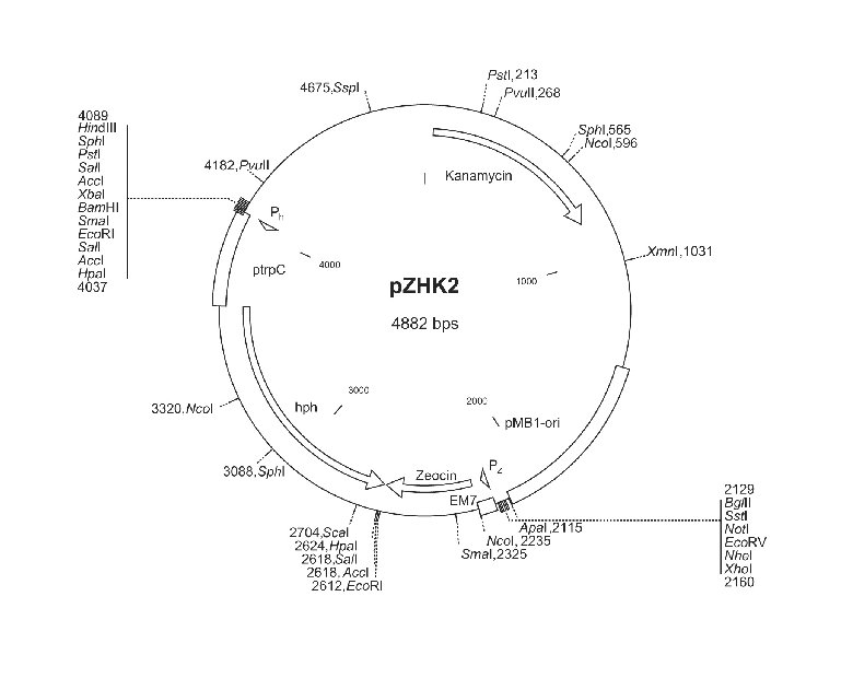 Figure 1: Physical map of the vector pZHK2. Pz and Ph refer to priming sites on the bi-functional zeo-hph cassette. Size