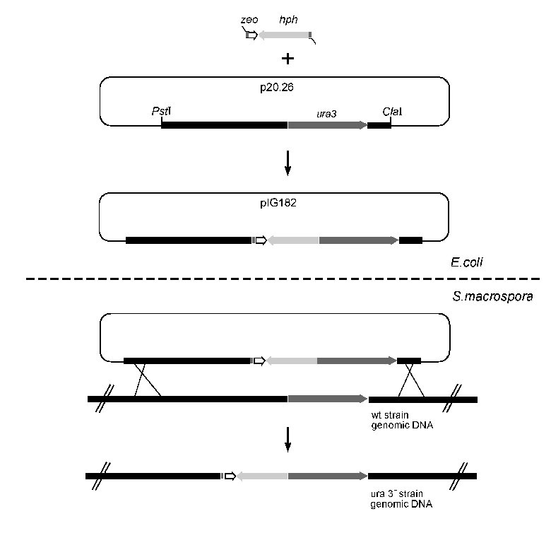 Plasmid p20.26 carries a 6.6 kb PstI-ClaI fragment from the S. macrospora ura3 gene region, and pIG182 is