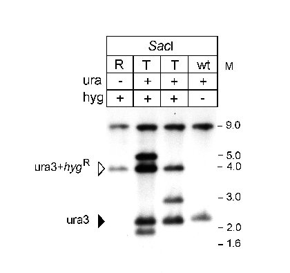 For transformation, plasmid pIG182 was linearized, leaving 5.1 and 1.5 kb of homologous sequence at each end of the resistance cassette. Fungal transformants were selected on BMM medium supplemented with 100 ug/ml hygromycin B. A total of 30 fungal transformants were then tested on minimal medium devoid of any supplements. One transformant, named T7, showed hygromycin B resistance, but was unable to grow on minimal medium without uracil. Using genomic DNA, a 6.6 kb PstI-ClaI probe detected in a Southern blot a 2.3 kb SacI restriction fragment derived from the wild type ura3 gene. This fragment can easily be distinguished from the 4.2 kb SacI fragment in T7, which carries the zeo-hph cassette and is inserted into the ura3 coding sequence. In order to verify the ura3 disruption in strain T7, plasmid p20.26 was used for DNA-mediated transformation of the auxotrophic recipient strain. The analysis of DNA from two representative prototrophic fungal transformants is shown in Fig. 3.